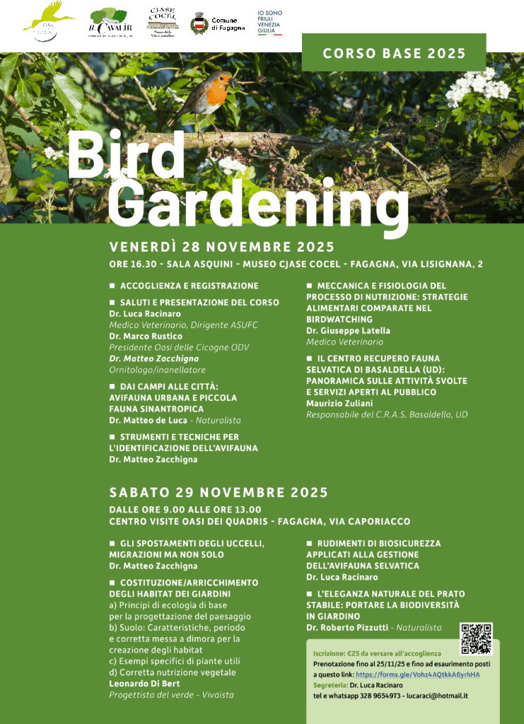 Il corso base di Bird Gardening si terrà all’Oasi dei Quadris e presso Cjase Cocel nelle giornate del 28 e 29 novembre 2025, offrendo un’opportunità unica per avvicinarsi al mondo del birdwatching e della cura degli spazi verdi a favore degli uccelli selvatici.